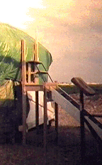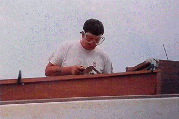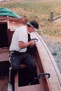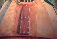 9/7/95 Thunderstorms and pouring rain, but all had cleared up by 11:00am, and although overcast, it was sunny and very close and humid. Put the white curtain up around the van windscreen to try keep the temperature down in the van during the hot midday sun. It does keep the van somewhat cooler. Set up the marine battery charger we had bought so that we can use the fridge and van fan and keep the van batteries topped up. We are short of nothing in the van. The 12v fan has been a boon in the van. During the night/early morning we can reach out with our foot and switch it on/off at leisure. Decided now we had to find out from where and for how much we could get the tabernacle pattern pieces made up in stainless steel. Took over the tabernacle patterns to a local Stainless Steel workshops in the boatyard. They had no guillotine or mill and they buy in cut sheets. It was cheaper for them that way. The chap was going that way this afternoon and could take our patterns with him, and see how much it would be. Left it at that. We decided 8mm stainless steel would be what we needed to make a substantial tabernacle. We had seen so many feeble and flimsy looking tabernacles on board yachts whilst we had traveled around. It is our intention to build this Yacht as an ocean going, round the world Yacht. Back on board decided to check and replace all sheet eyelets where necessary. Needed some more spinnaker repair tape. No problems because they sell it in the chandlery. Popped over and paid the rent. Heard later from a neighboring Yachtsman , maybe true, maybe not, that a new Top manager has started in the boatyard, who has no interest in boats at all, only money, and already he has been going over the site to see where he can make his mark. This is how the 'No Fishing' sign had suddenly appeared, no doubt. Next we will come down and there will be a ‘No Boats’ sign!. Started thinking of the main companionway hatch again and how could we make a start on the combing (for the spray hood), which is all to be made in combination with the hatch and hatch box. We found a length of 9mm ply, just the right length at 68" and 8" wide. Ideal to make pattern for the spray hood combing. Next how to bend and shape it and keep it like that. Need 2"x1" or similar. Found length of mahogany 66 ½", ideal length and screwed onto the end of it short lengths of 2"x1". By bending the ply decided that 1 ½" would be enough to give a decent curve. The mahogany then sits on the companionway hatch runner beams, and the ply at the moment sits on top as well. Used a compass to scribe the ply to the deck, and sit over the hatch runner beams. This was cut with jigsaw @ 45degree angle etc. Two fittings needed to get a good fit. Then using the pattern of the hatch-end section, which we had been able to make up during the week, cut the ply so that the hatch will in effect slide underneath the combing. Looking good so far. Used the hatch pattern to draw the top edge curvature on the ply and this was cut.
