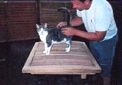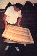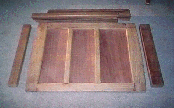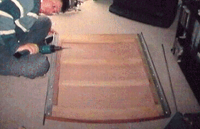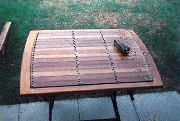 Completion of Companionway Hatch and Runners. August 1995 to September 1995. 23/7/95 Excellent weather at the moment. Summer is finally here and lots of boatyard activity today. Uncovered the boat first thing and assessed next stage with the hatch. Started routering all inside edges of the outer frame. Then with fence and flute bit routered out further rebates. 9mm for ply and 6m for Iroko. Suddenly remembered on the 2nd side that we should be doing the corners taking into account the centre beams, like we were doing for the forward and aft pieces. No big problem though as we could reshape the ply to fit. Then set to scalloping out the under edge of the two inner beams to the correct curvature. The jigsaw was used to remove the bulk then the compass plane used to finish it off. Completed it with sanding down. Once both beams done, used a router bit and rounded the under edges of the two centre beams to within 3/8" of the outer edges, then sanded the lower and two side surfaces. Reassembled the frame and took it up for a fitting and further assessment. Planed down to height the upper drop board. They were only ply at present but will suffice for the time being. During the week made excellent headway on the hatch. The lounge floor sufficed as the workshop, using mdf board to protect the carpet. Weather excellent at the moment, which enabled the planing and sanding to be done in the garden. Lots of wood shavings which all had to be picked up. The forward and aft beams were planed on the underside to the correct curvature. Then the frame joints were epoxied together. Three ply inserts were then cut out. Managed to get all three pieces out of one off-cut. Very little timber is actually wasted on the project. The ply inserts had to be very well sanded down on the underside, and the frames were given a good sanding on the upper surface. The sikaflex was flexible enough – being in the van during this heat. Had no brown – used black, but just enough to make a seal. Gripfast nails used to fix in the ply on all edges. The Iroko, pre planed lats where then cut to length, shaping them to fit the curvature at both ends of the hatch. The 17 lats were then drilled out and holes seated in, and screwed in to place with 120 screws. Odd lats were twisted slightly and needed pressure to hold in place until screwed. There were 7 lats each side. The centre piece needed to be sized to fit perfectly and then drilled , and holes seated in, then screwed in place. Next was the decision how best to do the edging, as the lats are about 6mm proud of the hatch top. With the router and using a piece of iroko screwed to the bench for butting up to, routered two lats at once. One piece was only routered halfway, this would then go with the next lat in sequence to be completely routered, and the next lat half-routered. This was to prevent the router splitting the timber on the outer edges. A awful lot of work had gone into the hatch so far, and it is really looking ‘ambitious’, as one of our boatyard neighbours put it.