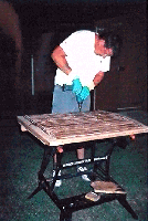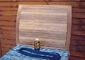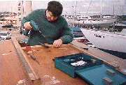 On the boat put in the two missing screws ( 2 ½") on the two main hatch runners, and then put in the 8 iroko plugs with epoxy. Needs the boat leveling up perfectly, to enable the mast step to be sanded down perfectly level, for the tabernacle to be seated properly. Weather was so hot today, even the breeze was not enough. It was really too hot to do anything. The coolest place was sat in the cockpit. The bilges and lockers were hoovered out. 19/8/95. Not been down the last two weekends. When we got home from the boat on the Sunday evening, two weeks ago, we set to epoxying in place the hatch lats in the back garden. Epoxy and gloves, acetone setup. 120 small (10mm) iroko plugs sorted out. The 120 screws were part screwed into all the lats in readiness. It was getting dusk, and ended up working with the garden light on. There was 15 lats in total, and the epoxy job was such that all needed epoxying in place in one job. Resin and microfibres mixed in readiness. We had to work swiftly though to get all 15 lats in place, in order, and screwed down with the Makita, being careful not to get epoxy other than where it was needed. When we come to put the dowel plugs in, what a palaver. The dowels were a tight fit, and would not go in the holes if there was epoxy already in there. So all 120 screw holes had to be cleared of epoxy, and having soaked the 120 dowels in epoxy, hammered them into place in the holes. Then as best we could we scraped as much surplus epoxy as we could. By now 11:30pm and cleared up and just in time to obtain a Chinese.